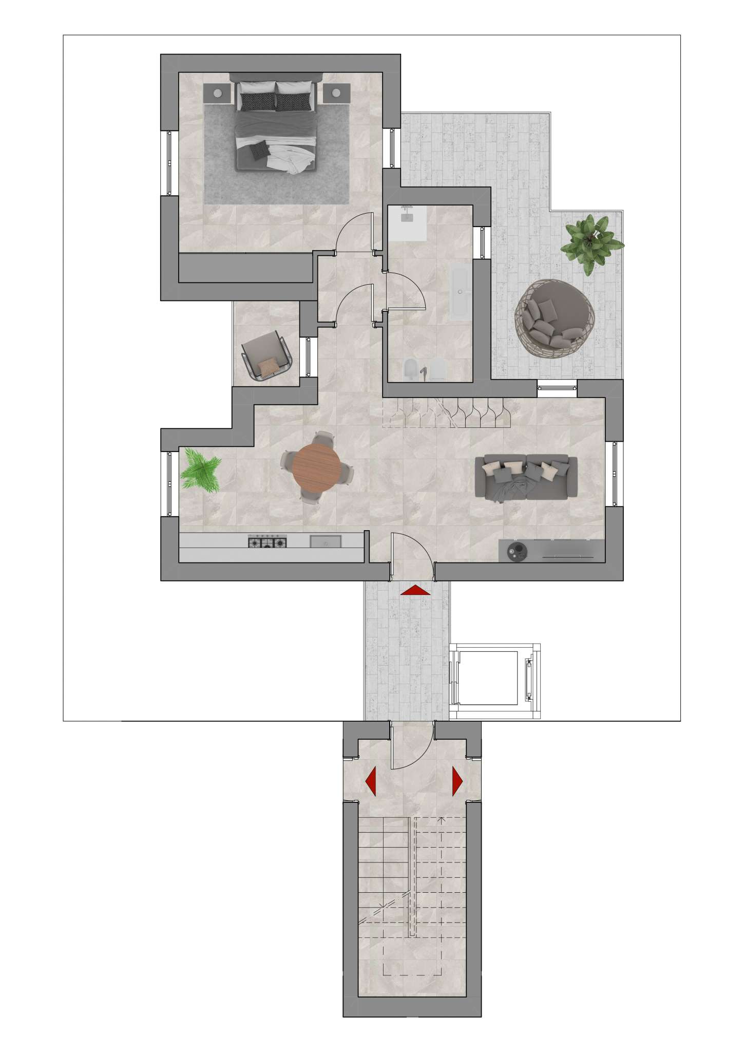 Una scala di design conduce al piano sottotetto, ove sarà realizzata una camera da letto doppia con accesso ad un terrazzo panoramico oltre a un secondo bagno