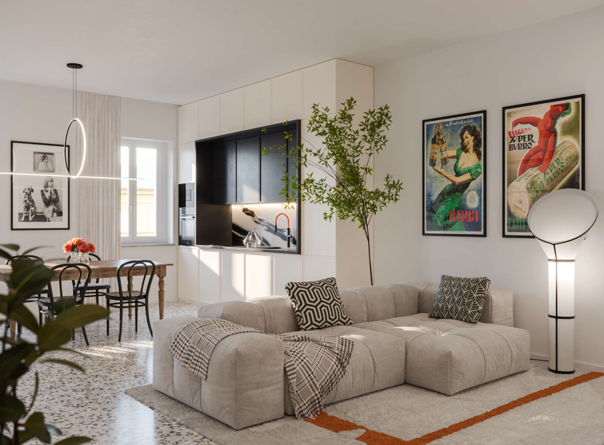 L’ingresso sulla zona giorno, ambiente di generosa metratura, open-space, con cucina a vista, zona pranzo, zona living ed un bagno ad ospiti.